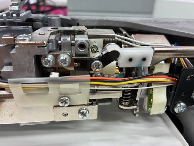新しい送りモジュールについていない糸切り機構を旧部品から取り外し、新しいユニットに取り付けます。