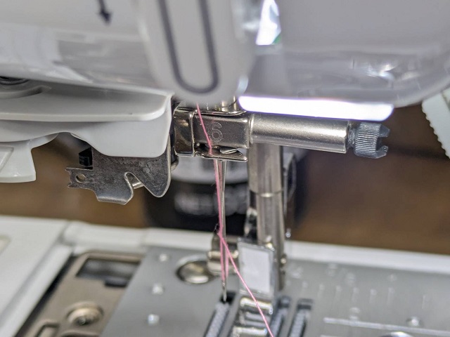 糸掛けの6番が針棒糸掛けになるのですが、ここに上糸がしっかりはい行っていないと針穴通し器が上手く使えません。