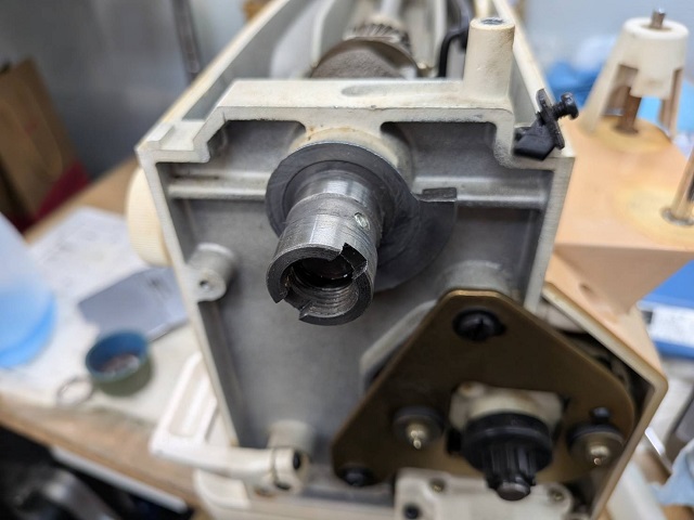 今のミシンと違い、今回お預かりのミシンは下糸巻時にはずみ車の中心にある部品をゆるめます。