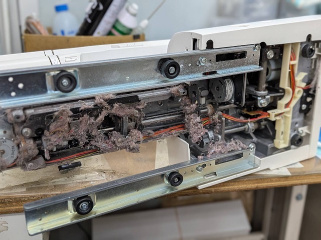 かなりご使用されているようでミシンの底にはかなりの埃が溜まっておりました。