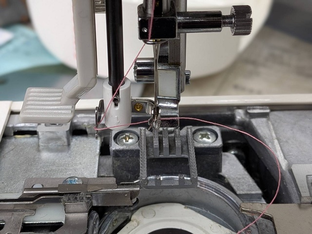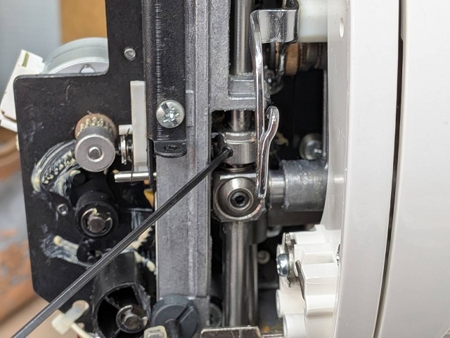 フックの交換後は針棒にある金具の位置を調整し針穴通し器の下がり量を調整いたします。
