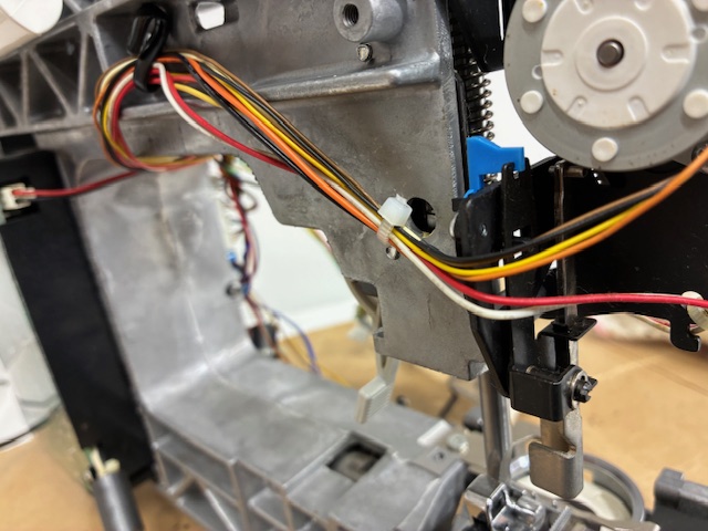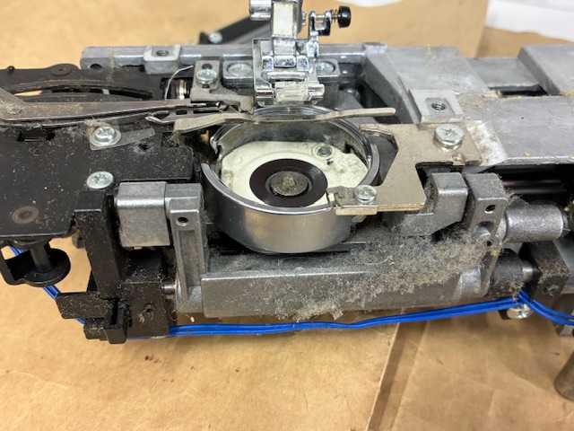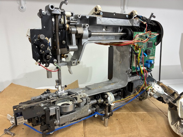 修理するにはフロントパネルを開けて針棒機構を外す必要があります。